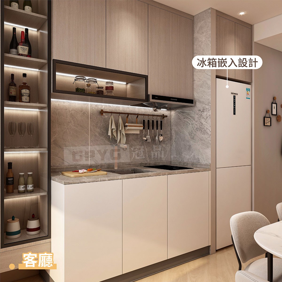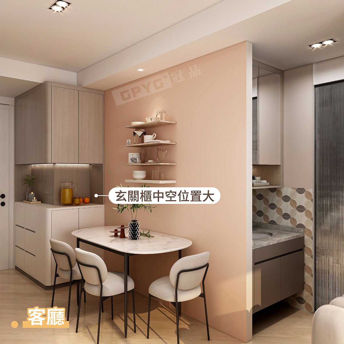 入戶後左手邊設計成一組餐邊櫃,滿足嗮戶主放音響、泡茶、沖咖啡的日常☕。