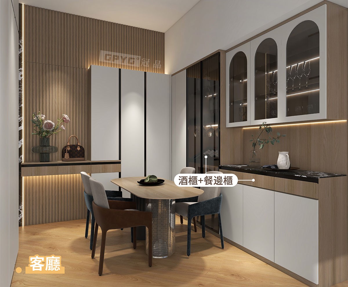 客廳嘅餐邊櫃➕酒櫃🍷設計輕奢感十足💖,區域獨立劃分,動線合理🥰。注入多種材質打造,嵌入式等設計,現代感十足🤩🌟!