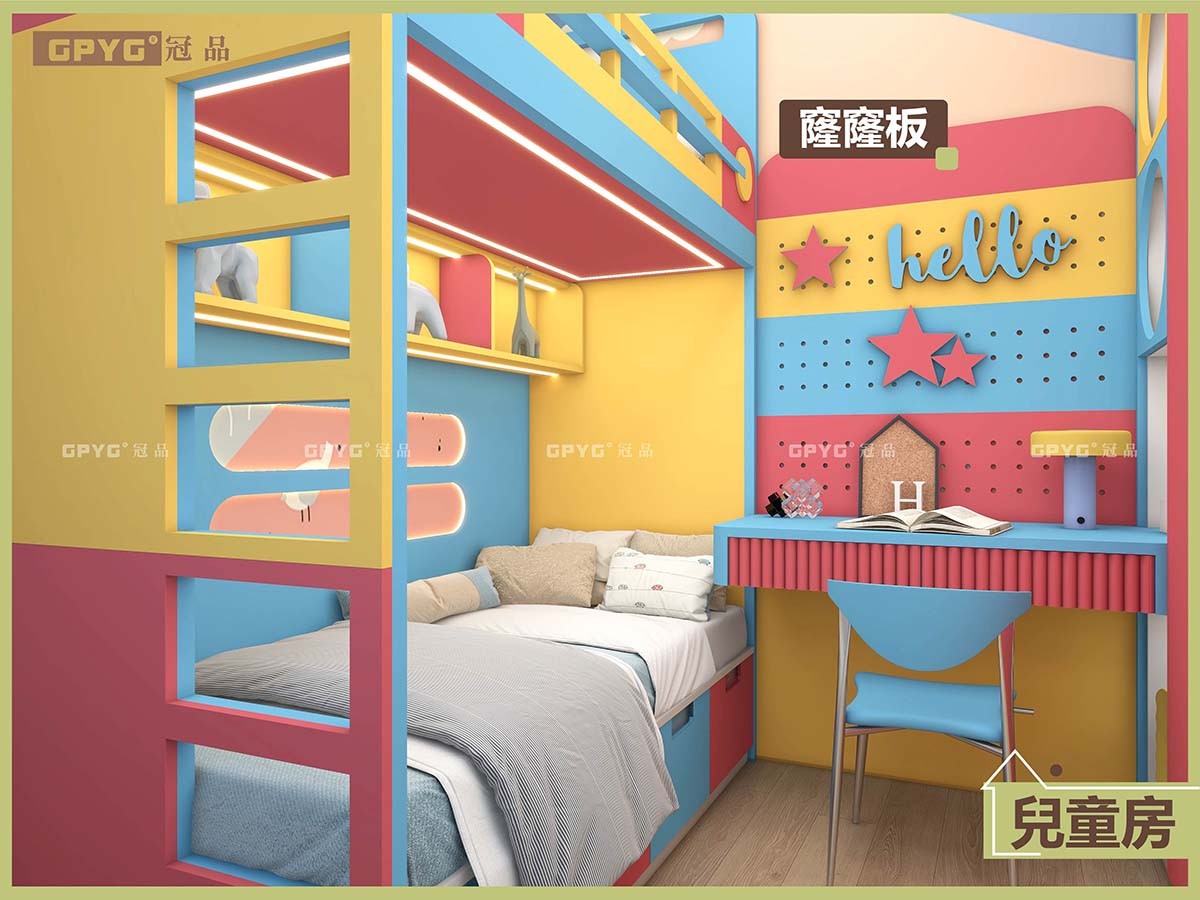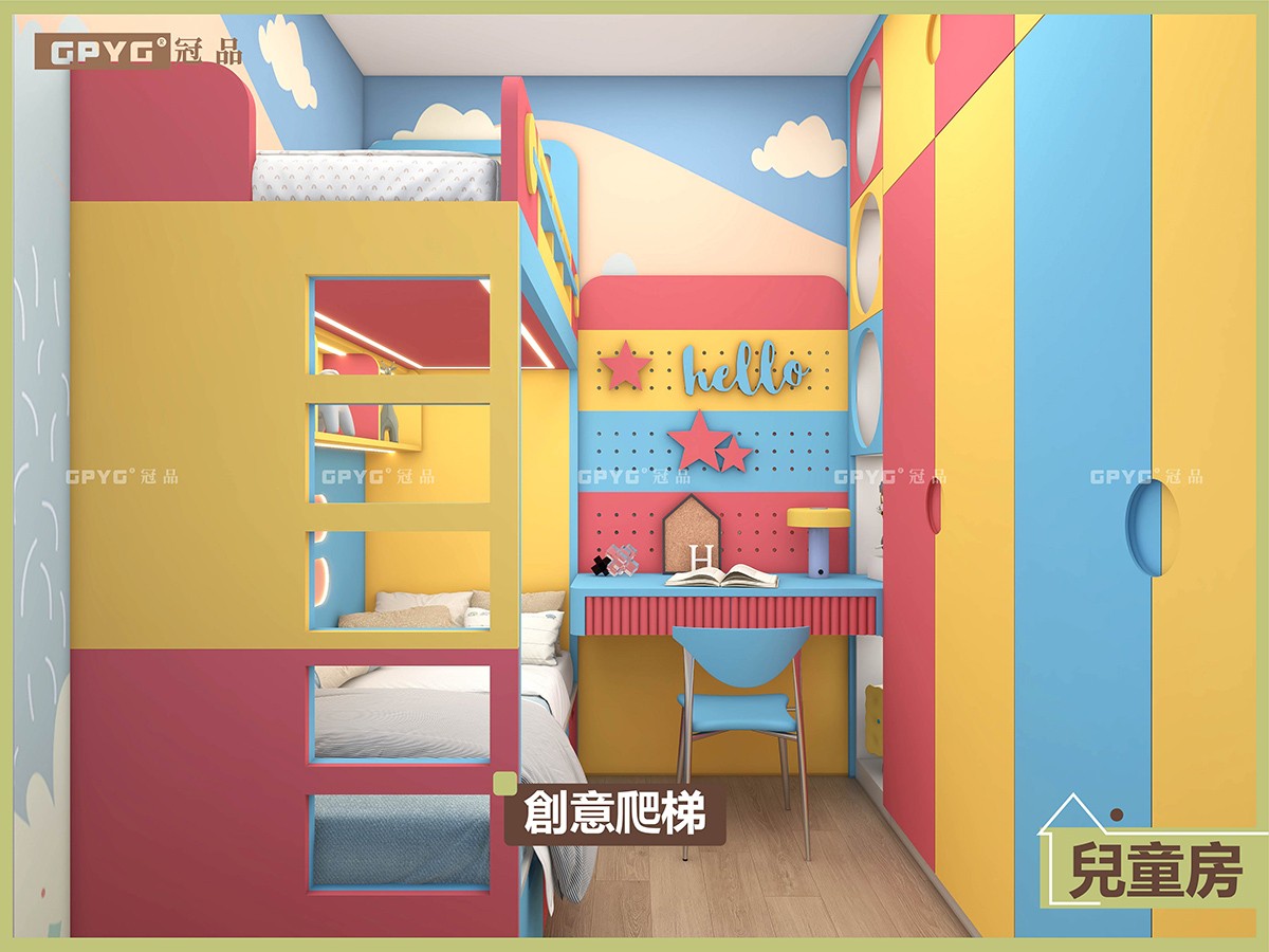 🛏️上床創意爬梯,慳位置嘅同時仲令到下床空間視線更加通透☀️,滿墻大收納櫃自然延伸一字型溫書台,學習📖、收納一體化,🔵藍、🟡黃、💗粉跳色玩到盡,整個房間充滿童真🌈,望落就好開心。