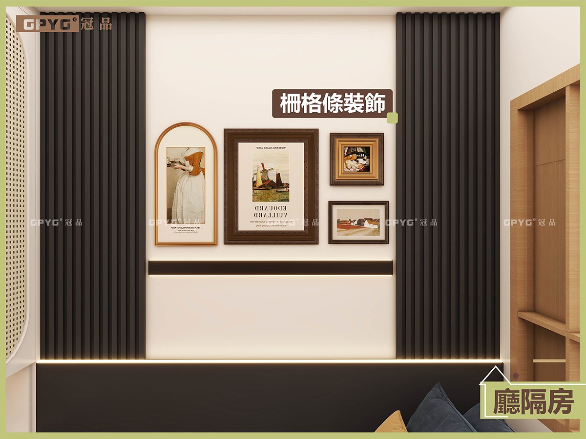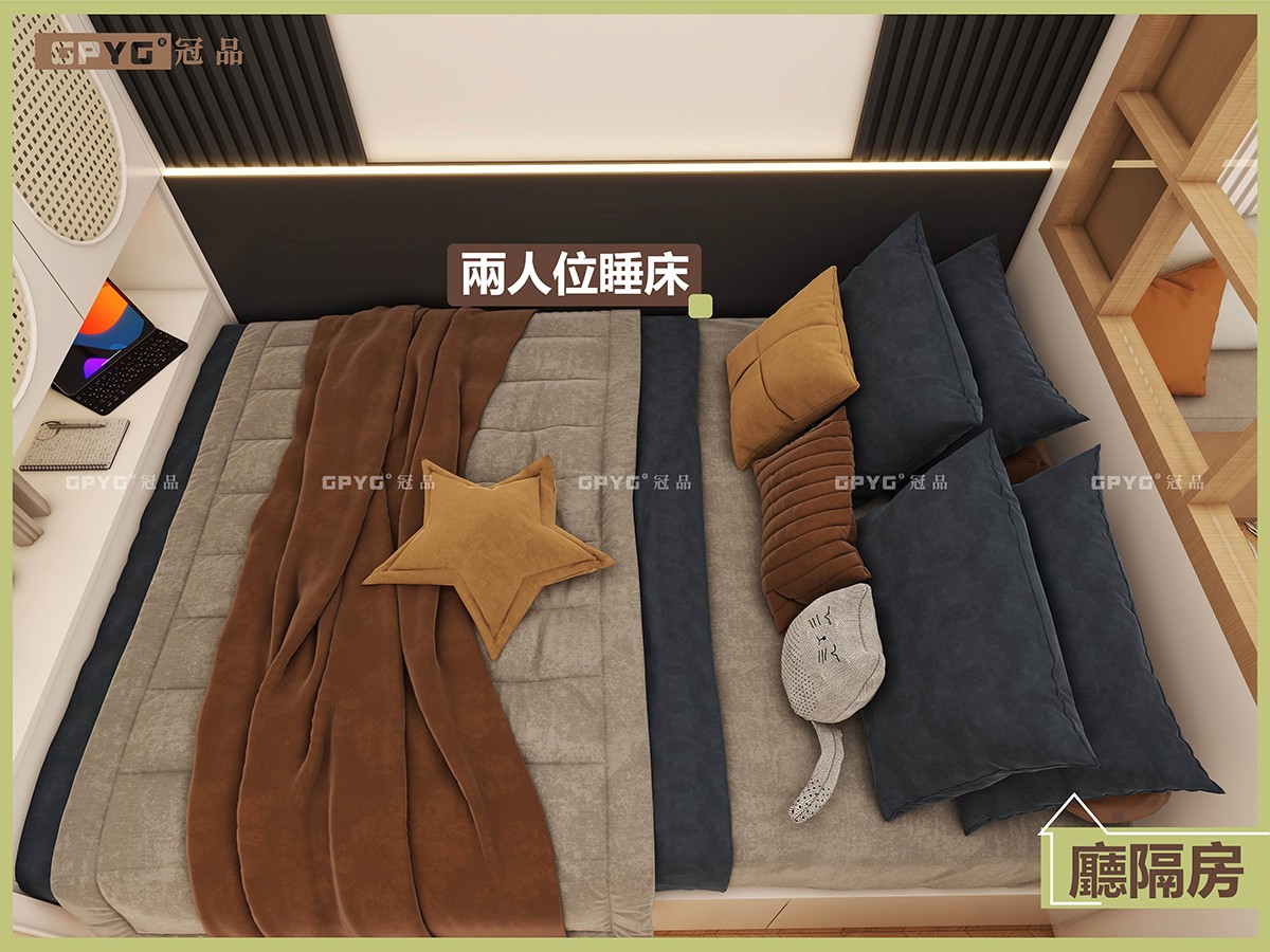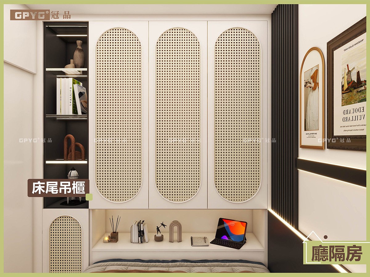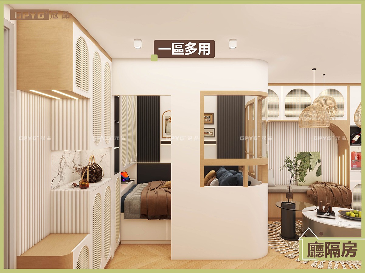 睡眠區:雙人位睡床,床尾做吊櫃儲物,床頭牆身加柵格條、靚得嚟又有格調。