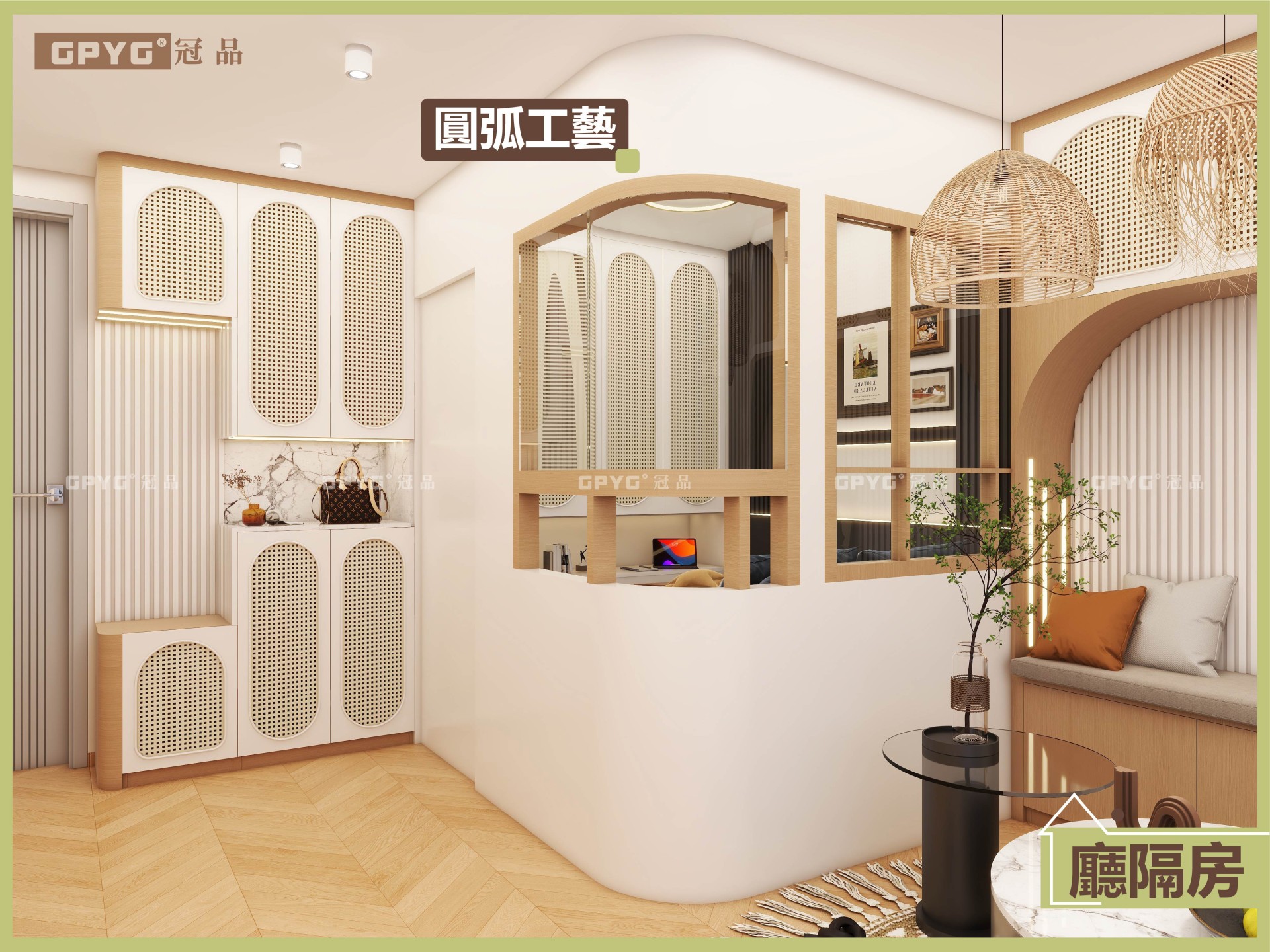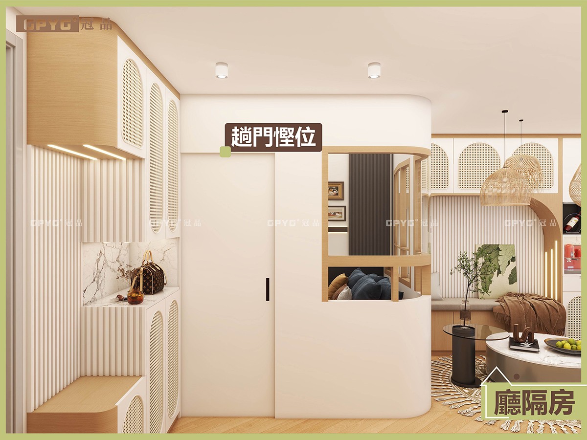 廳隔房設計:用趟門分隔空間,慳位之餘,門邊做圓弧工藝,唔怕撞親,細節位超貼心。