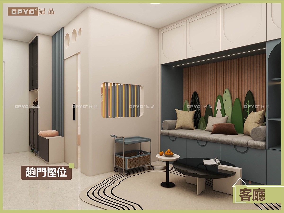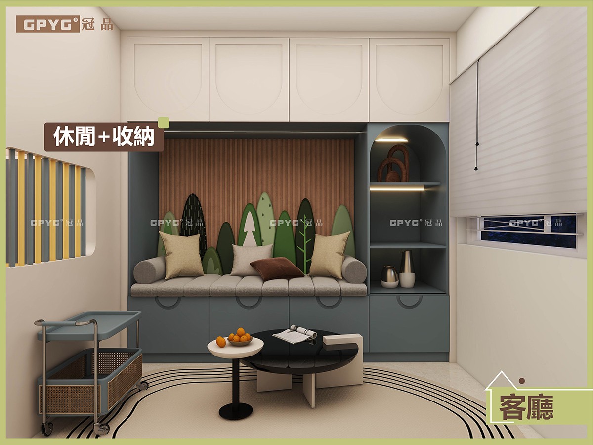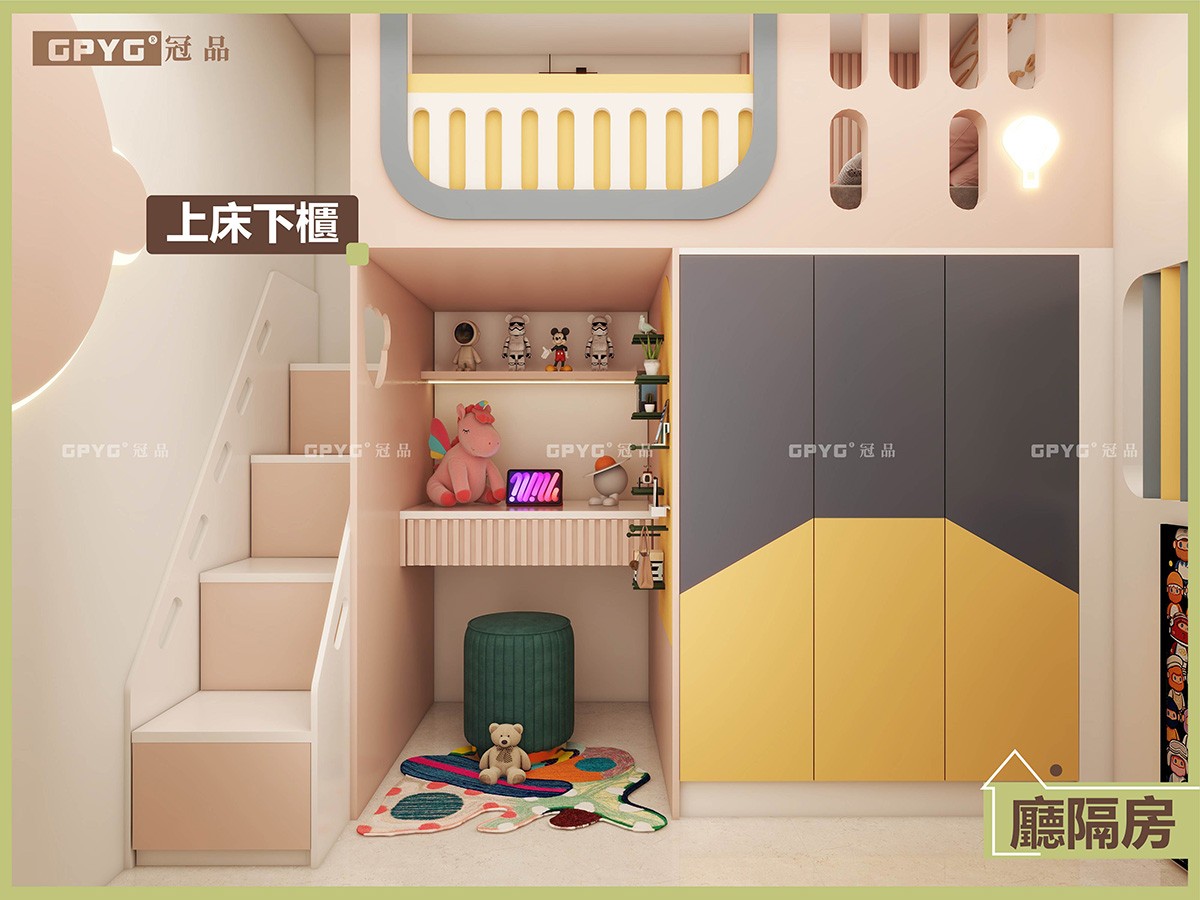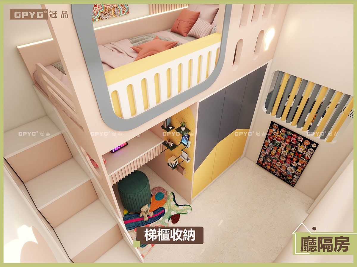 客廳梳化🛋️同收納櫃一體化,完美融合💠,美觀又實用,隔房上床下書台加衣櫃👚,充分利用垂直空間,輕鬆視線房間零雜物,上床全包式圍板令小朋友訓覺🔰安全感爆棚嘅同時,又非常有童趣感🌈。