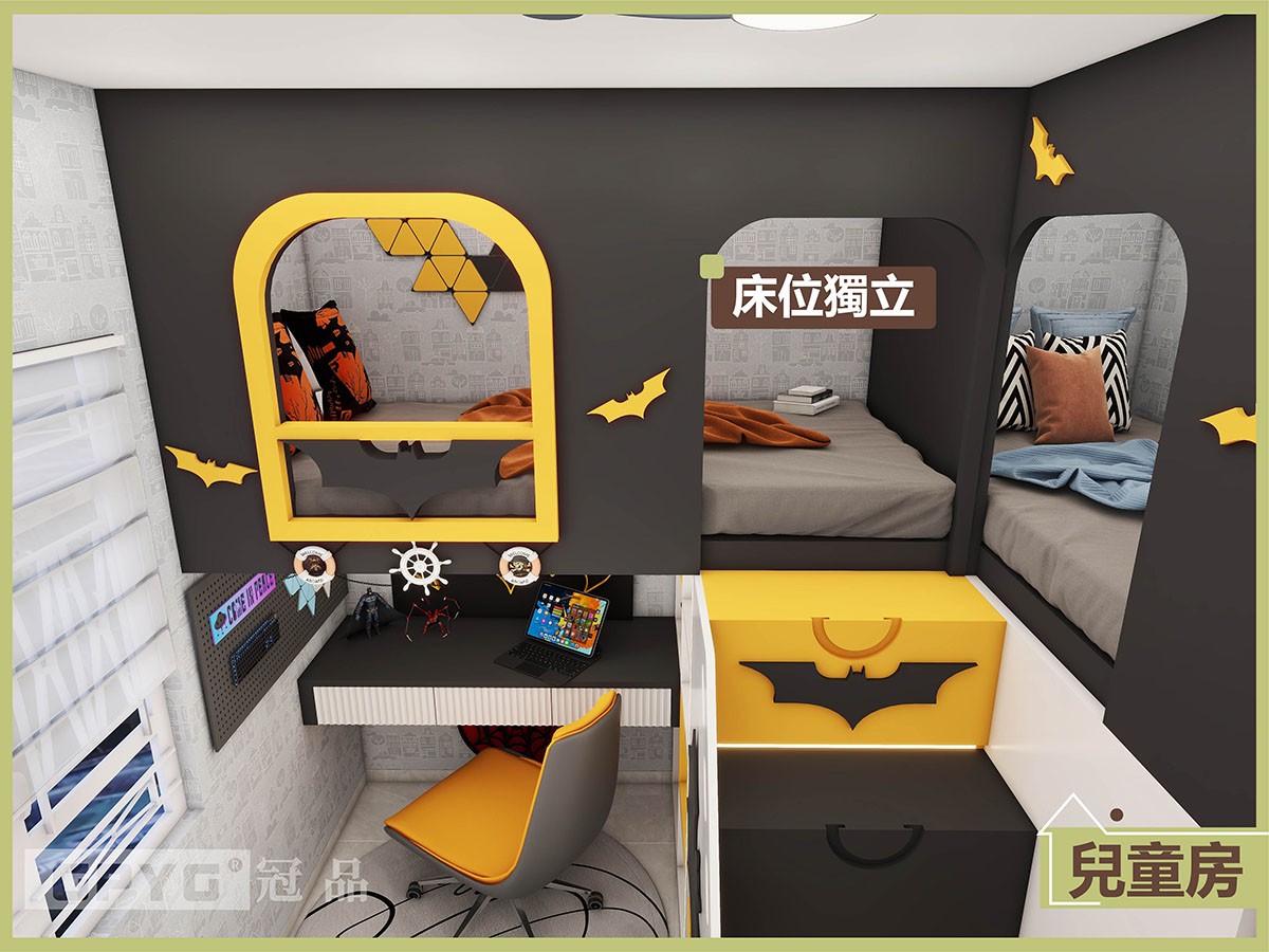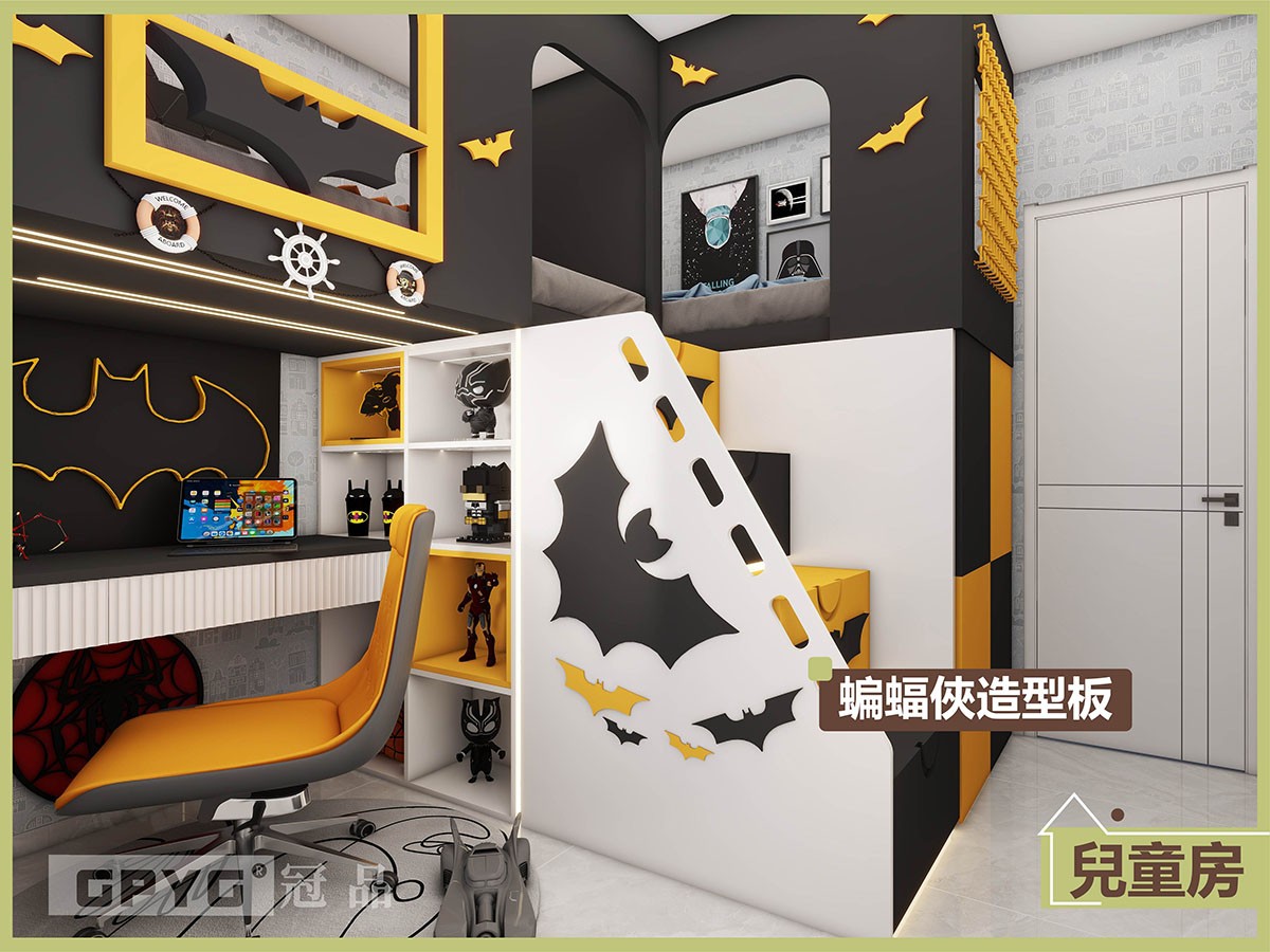 以經典的黑、黃、橙🖤💛🧡三色為主調,營造出強烈的超級英雄氛圍✨。雙床設計滿足兩位小朋友的居住需求,各自擁有獨立空間,增進親密又保持個性。☺😜