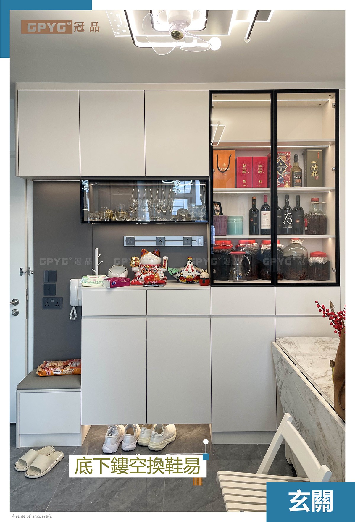小戶型的玄關設計,通過冠品宅配全屋訂製的精準把控,即使面對不足10呎的微型空間,也能打造出麻雀雖小五臟俱全的智慧收納系統。