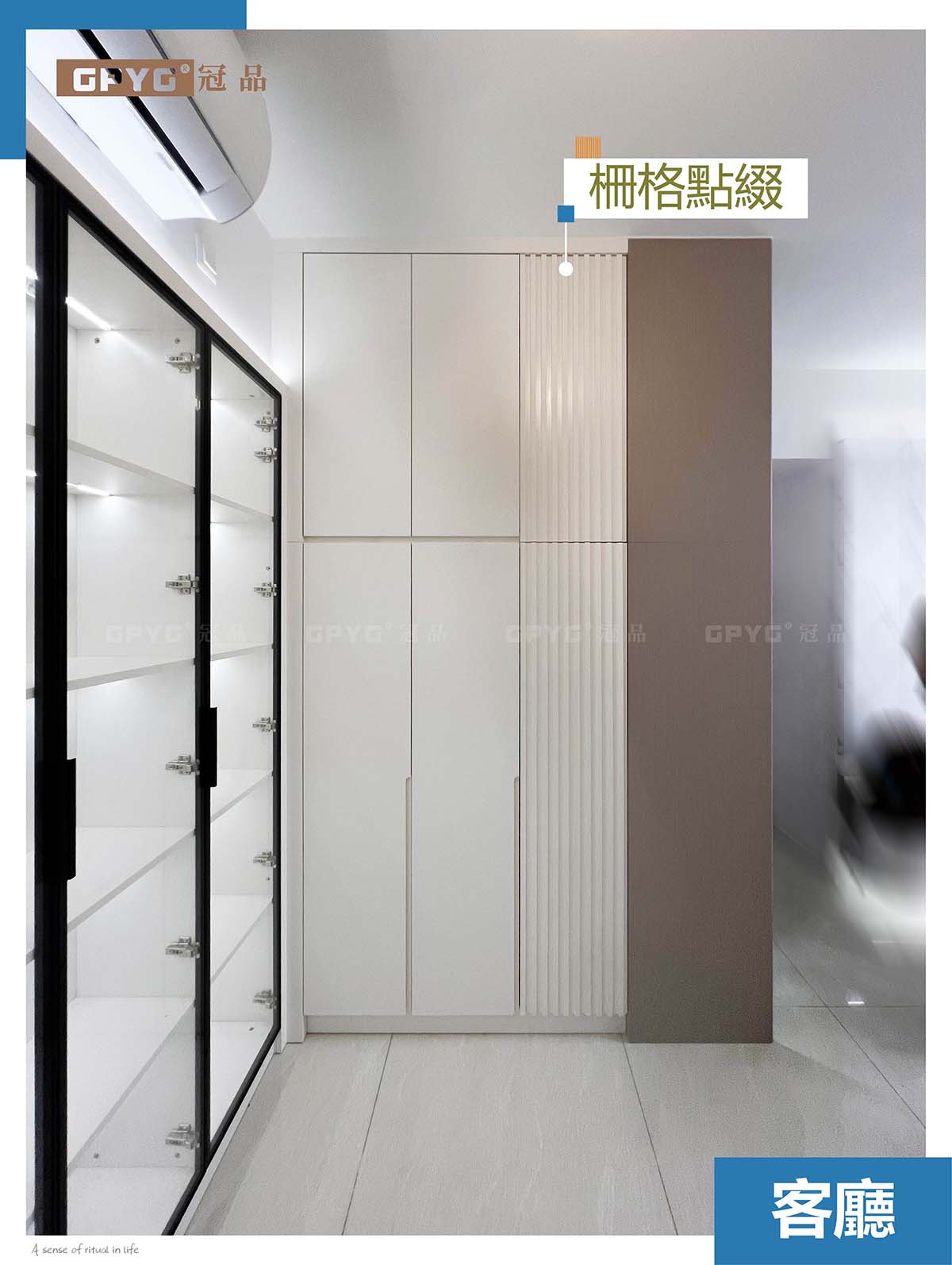 玻璃門展示櫃擺酒、擺獎杯,白色封閉櫃收書、收家電,連側邊都做咗開放層架擺裝飾,客廳瞬間變成「收納博物館」,但又唔覺得亂!