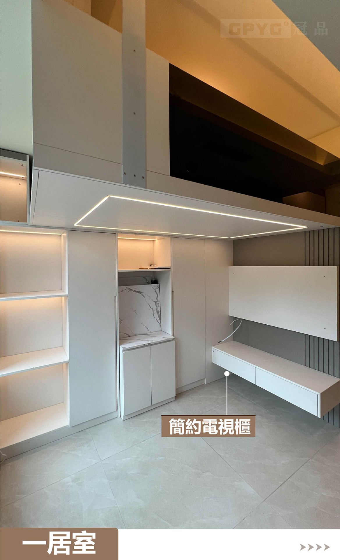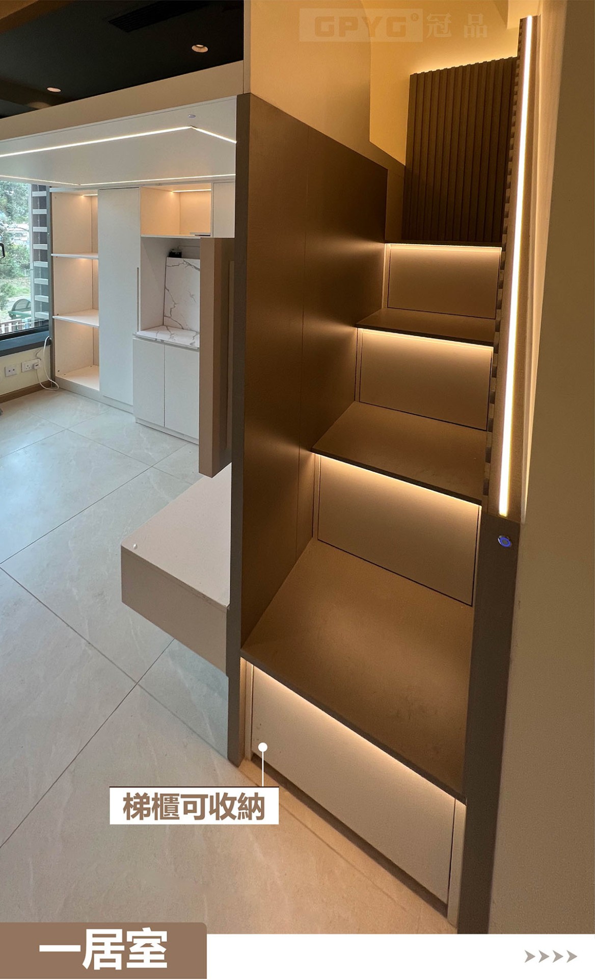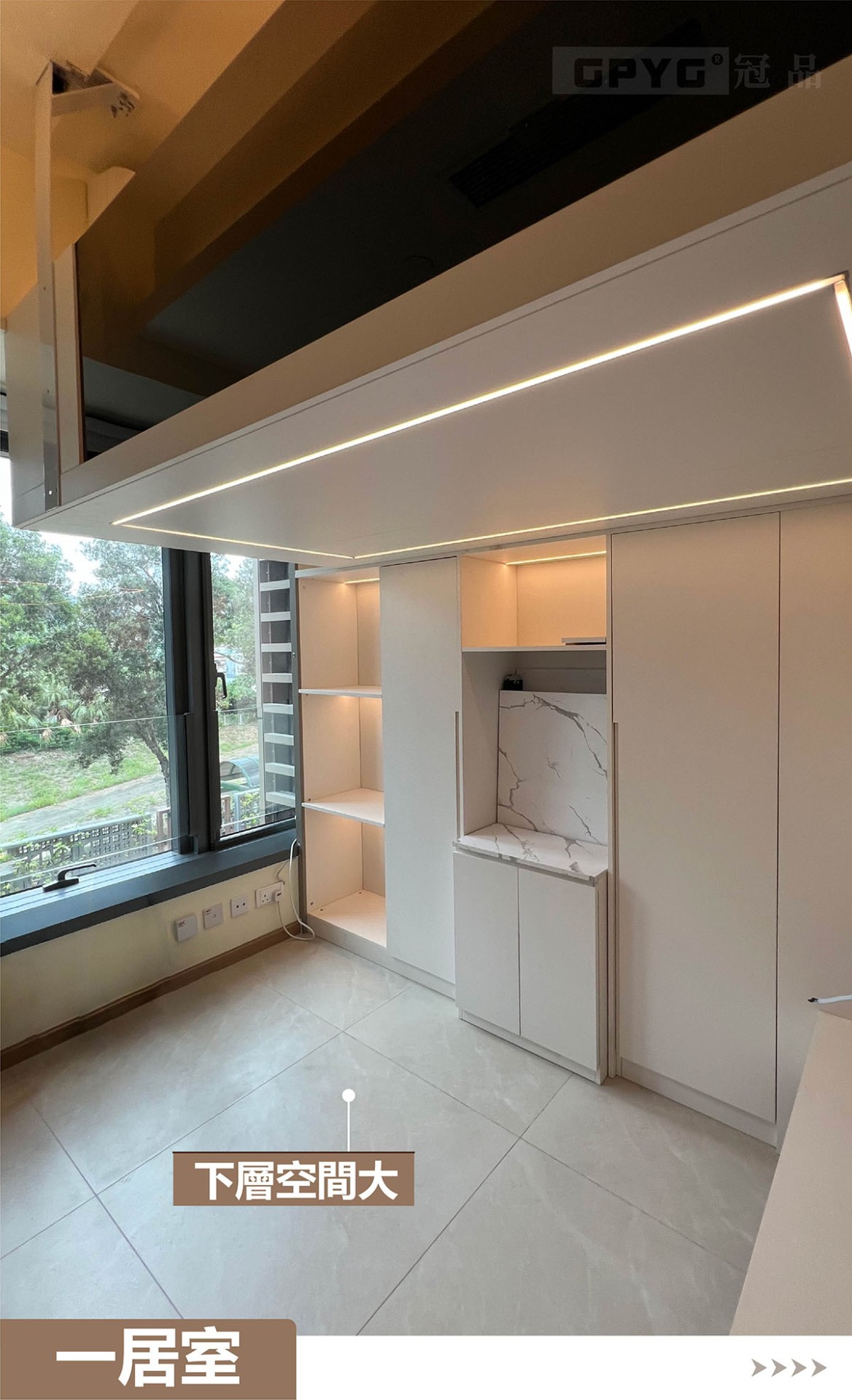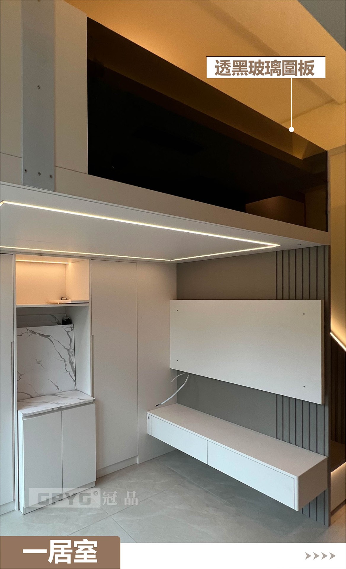 👉通常一居室嘅玄關到頂就比較重要,視覺拉闊👀,又可以儲物!客廳打造睡床,可以訓落兩人👭。上下空間分開!櫃體嵌燈顯床, 引路方便!😘