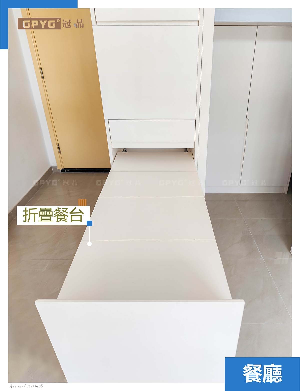 可折疊的餐台,隨時可收,不阻礙空間。防潮防蟲,對抗香港潮濕氣候:櫃底加裝鋁鎂合金踢腳線,有效杜絕蟑螂等小蟲「蝸居」,就算在香港潮濕的季節,也能保護櫃體和收納的物品,延長傢俬使用壽命。