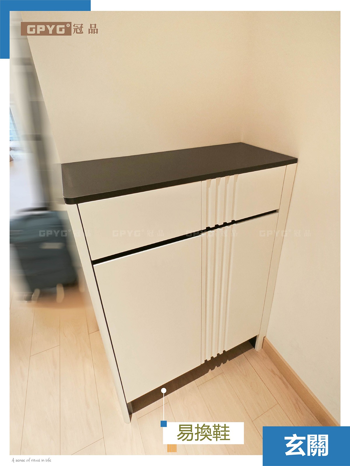 玄關櫃作為入屋第一個接觸嘅傢俬,設計好重要!呢個玄關櫃採用咗簡潔嘅白色櫃身,配黑色頂板,外觀好時尚。最正係下面有個懸浮空間,方便放常用鞋,換鞋時唔使周圍搵鞋。櫃體設計慳位,適合香港細單位,一開門就有整齊又舒適嘅感覺,實用性滿分!