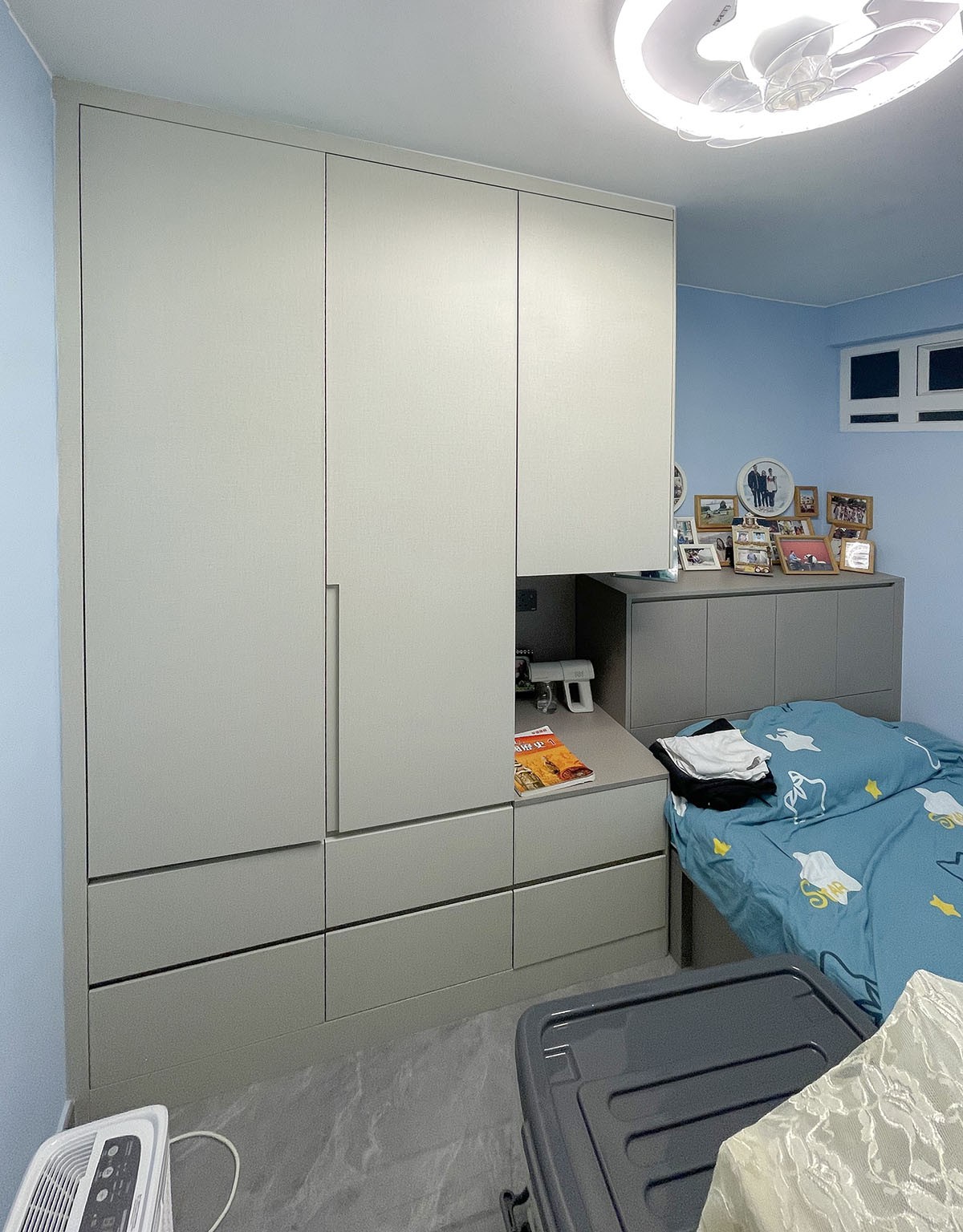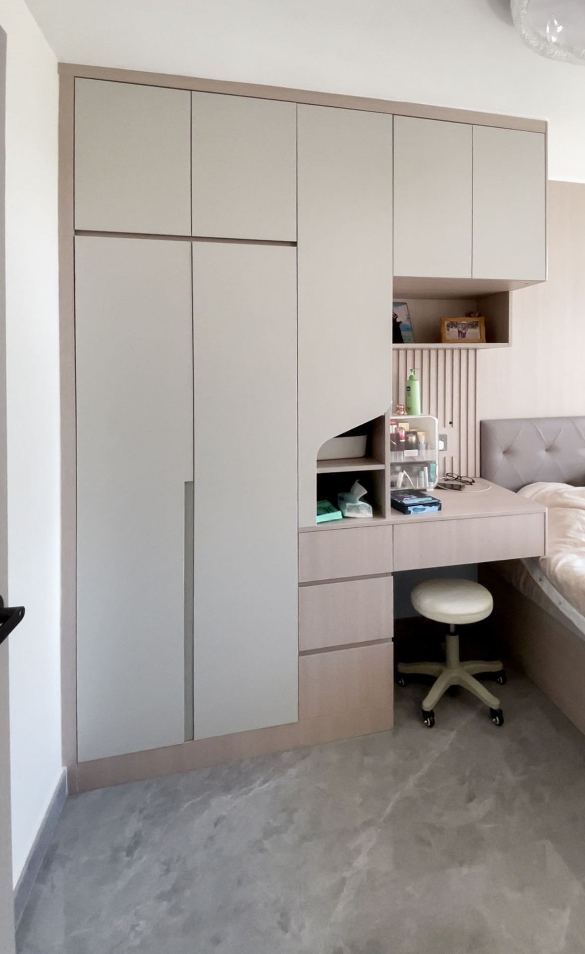 房內衣櫃自然延伸梳妝台,極簡無抽手設計,封邊收口細緻,令到視覺上更加一體化,實現多功能用途。