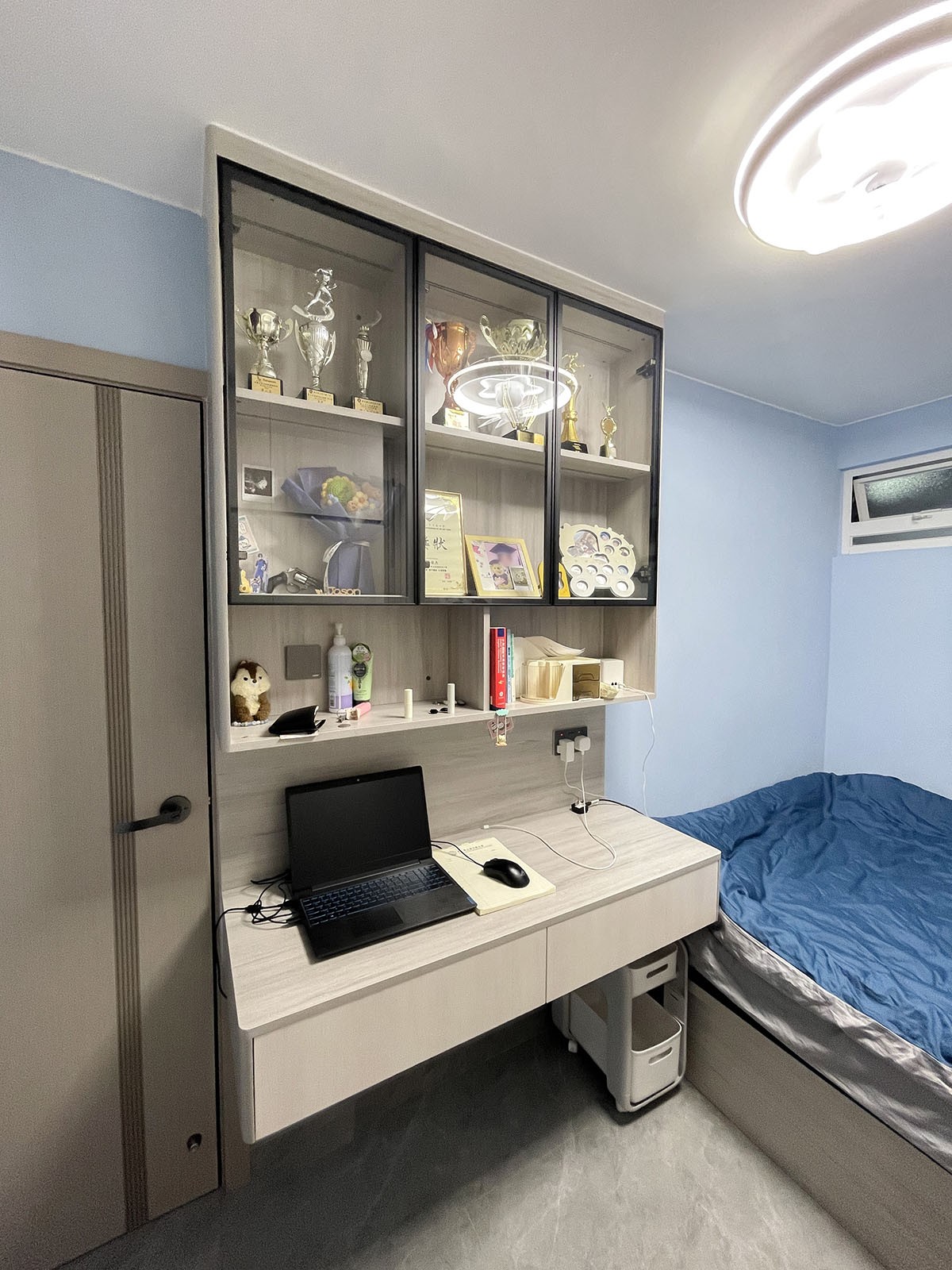 一字型懸浮書台同玻璃門吊櫃結合,空間得到高效利用,美觀又實用。