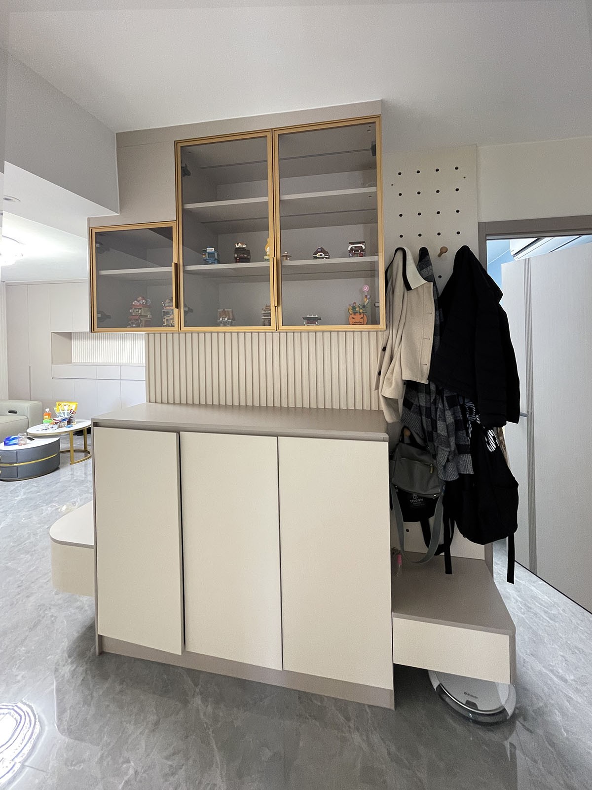 入門處滿墻懸浮C字櫃,滿足大量收納,中空位置柵格條護墻板點綴,底下鏤空位置唔單止方便業主換鞋,仲增加咗空間視覺輕盈感。