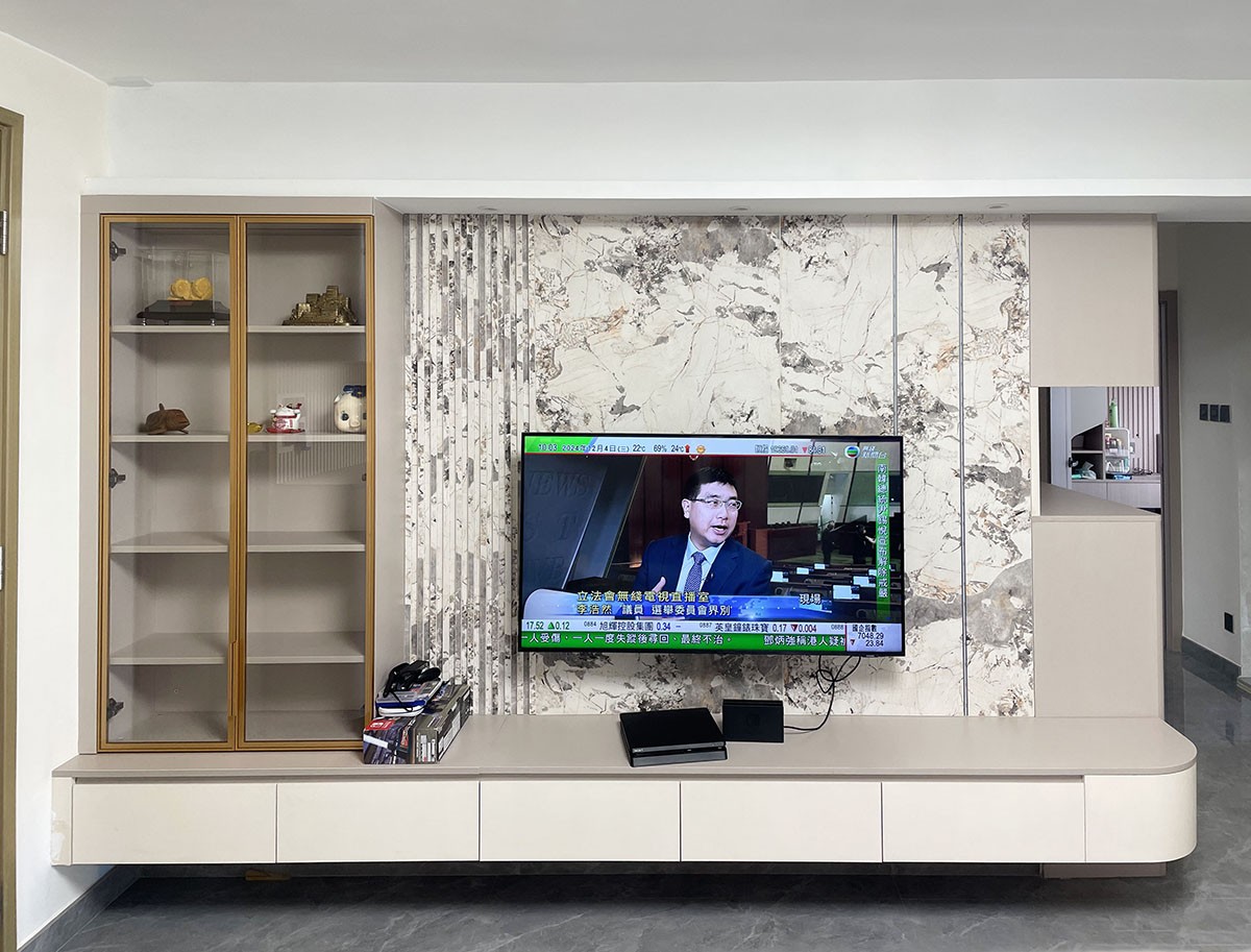 L型懸浮電視櫃,搭配大理石紋背景墻,增添意式奢華格調,金屬邊框玻璃展示櫃,展示住戶收藏愛好,底下鏤空方便清潔打掃。利用轉角位置無縫連接中空邊櫃,上下分層,窿窿墻任意收納,提供更高便捷性。