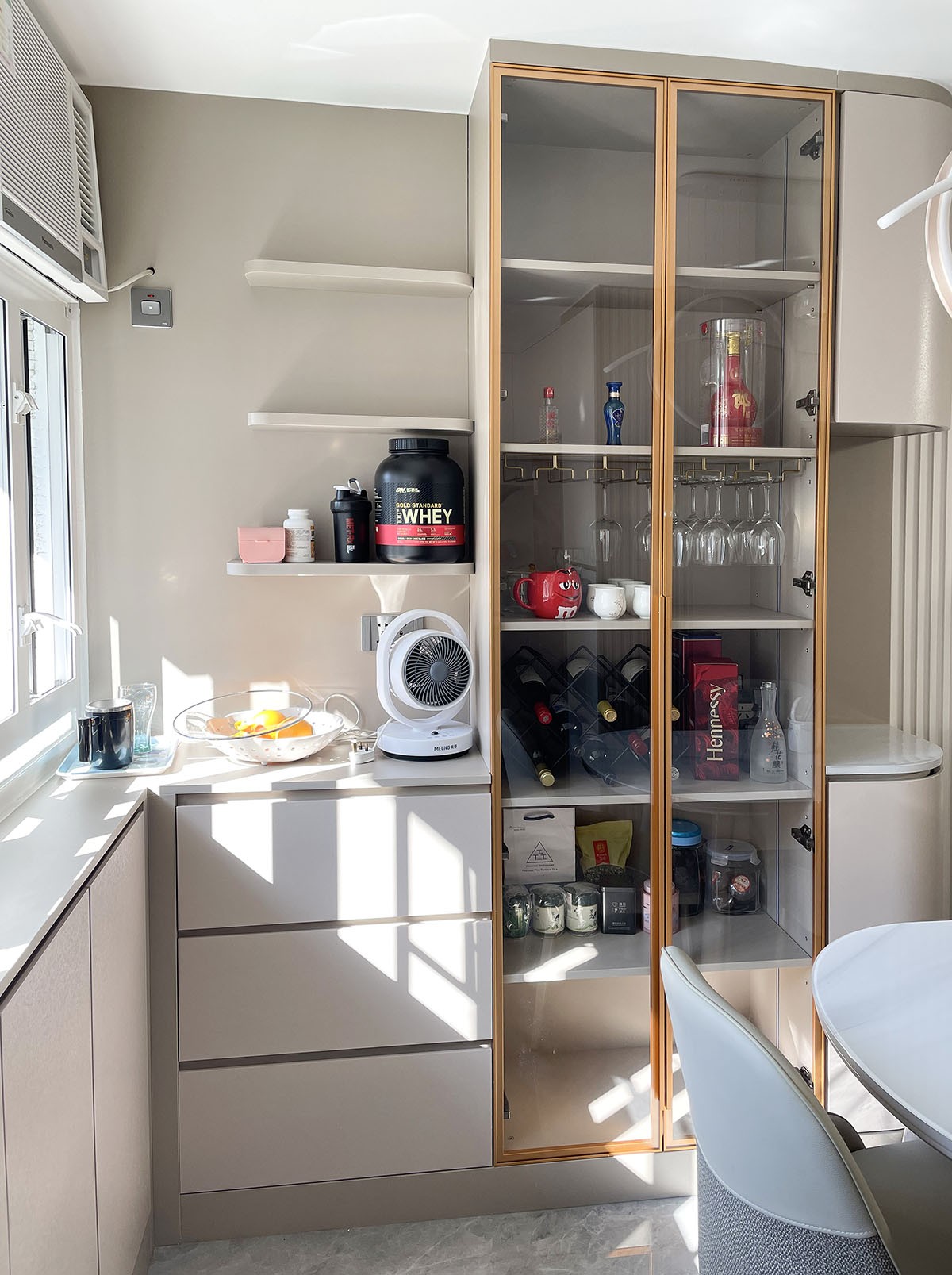 沿住窗下位置設計L型半身櫃,唔阻光線,一門到頂玻璃櫃門展示酒櫃,收納展示同時滿足曬。