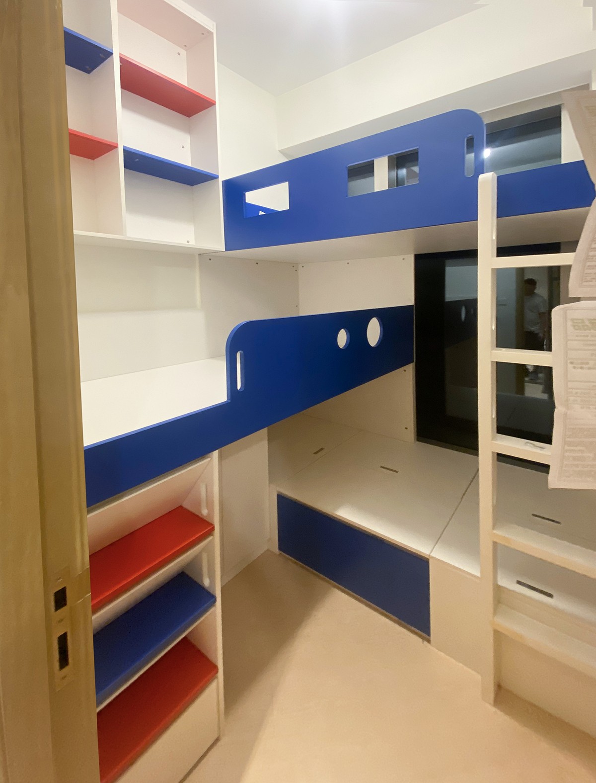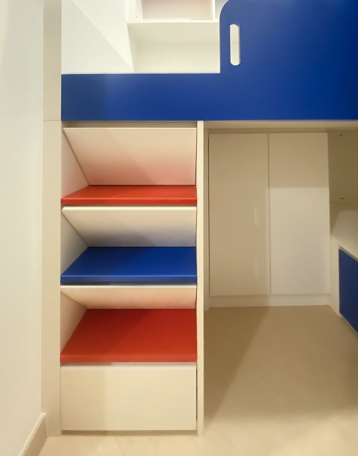 兒童房採用三床兩梯,錯落佈局設計,無論訓邊張床,上落唔打攪,用寶石藍、大紅色調,帶出美國超級隊長主題風,滿足仔仔囡囡童年小小偶像夢。