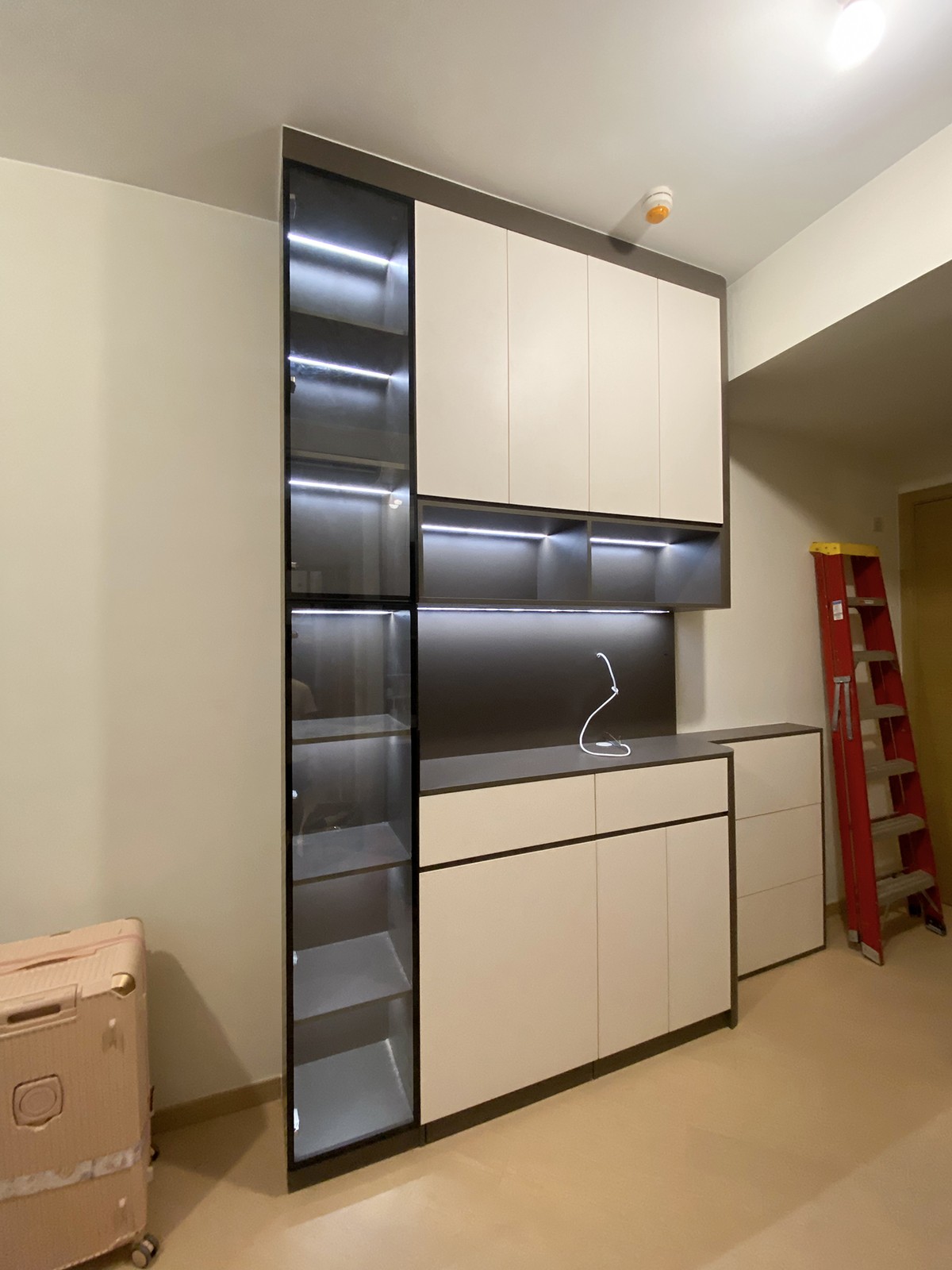 C字型組合收納櫃上下分層,極簡無抽手暖白色櫃門搭配黑框玻璃櫃門,形成強烈嘅色彩對比,令視覺上更加有層次感。