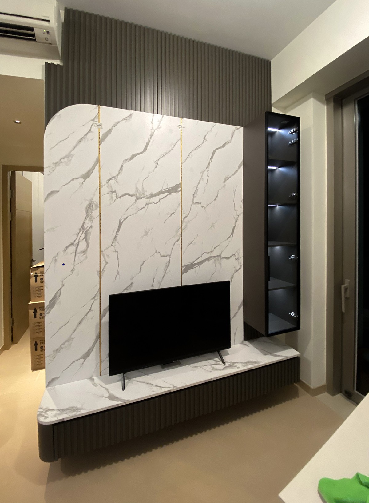 L型懸浮電視櫃,採用大理石紋理板材圓弧背景墻,紋理自然逼真,懸浮設計添加空間視覺輕盈感,搭配玻璃展示櫃,嵌燈工藝點綴,整個客廳營造出一種帶有歐式格調嘅輕奢感。
