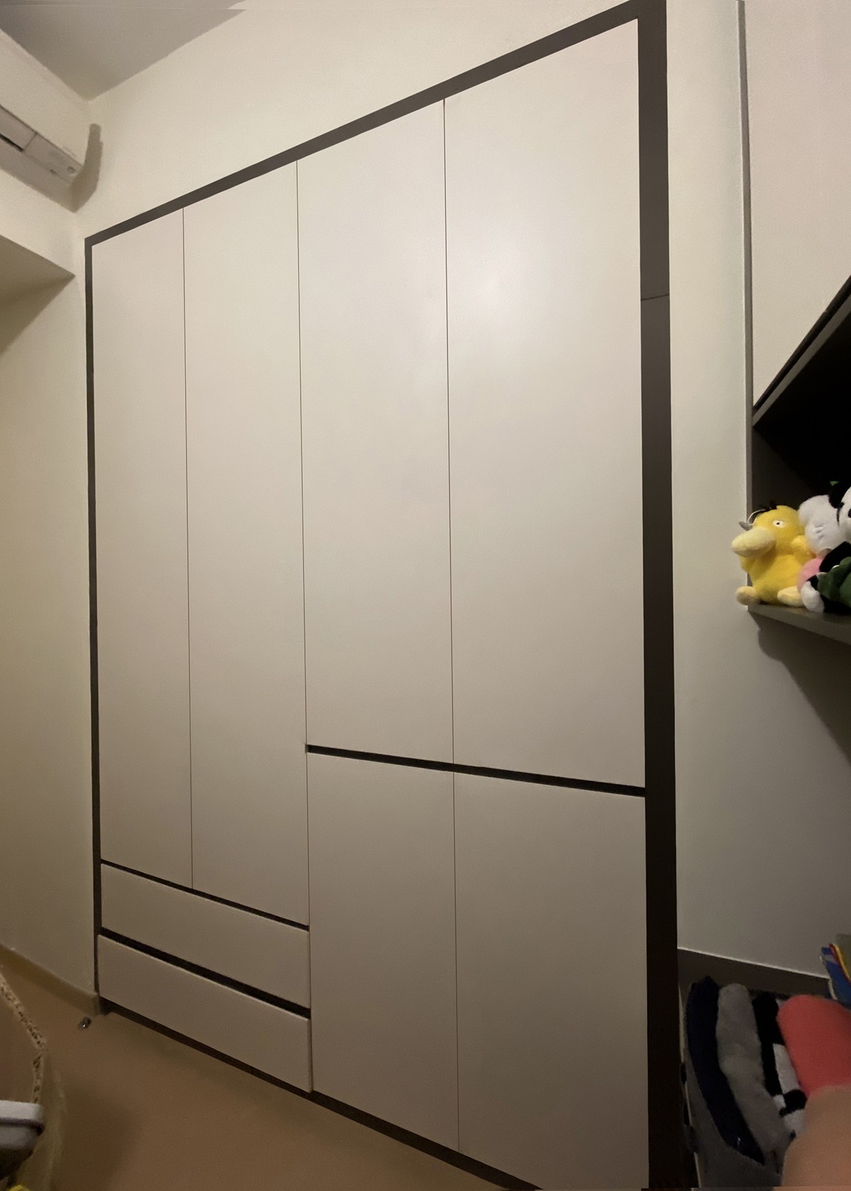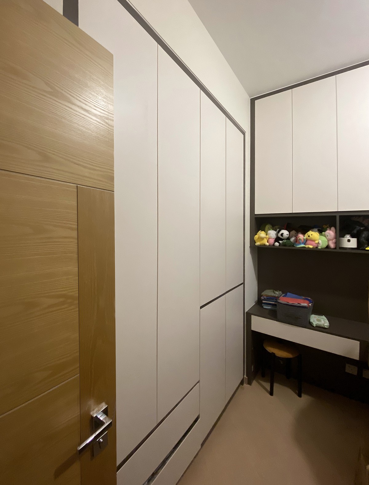 主臥嵌入式L型到頂衣櫃,自然延伸工作區,線條流暢,搭配摁壓式櫃門,係滿足收納功能嘅同時,又為房間增添咗一份整潔同時尚。