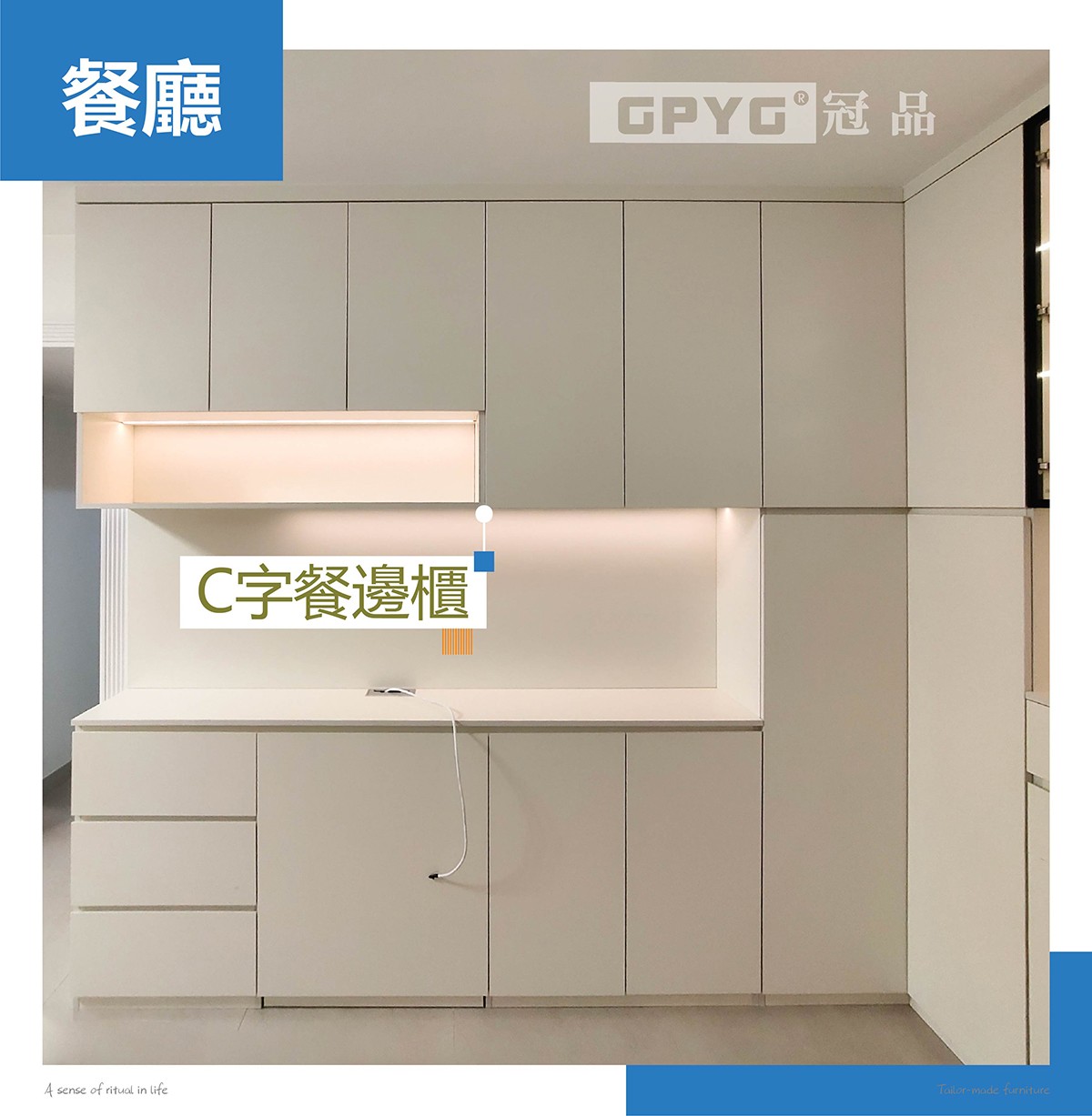 餐廳:C 字型餐邊櫃,上面儲物、下面擺嘢,中間平台仲可以放電器。