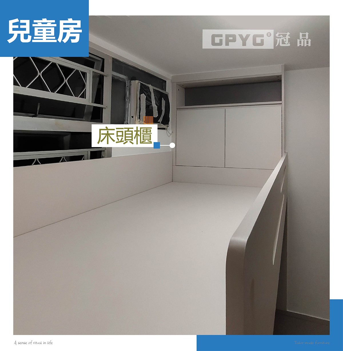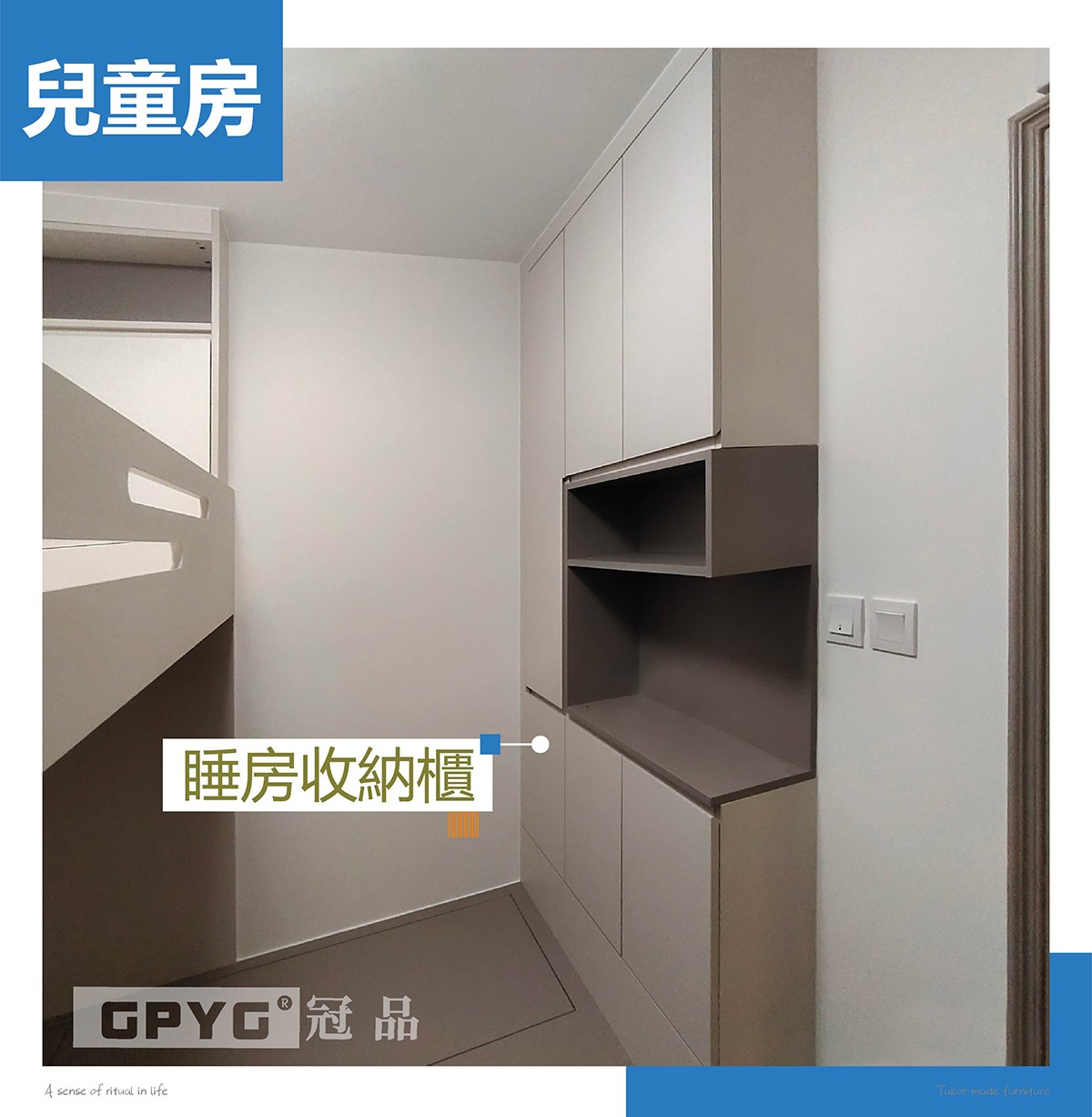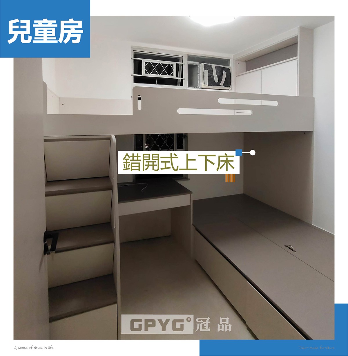 慳位設計:櫃體多數嵌入式,貼牆而造,唔阻空間。兒童房上下床錯開式設計,慳位之餘又方便上落。