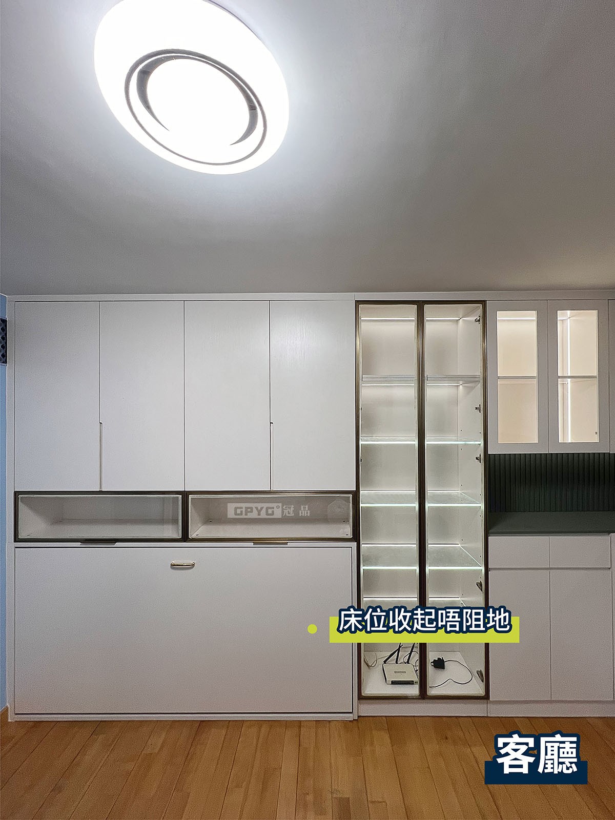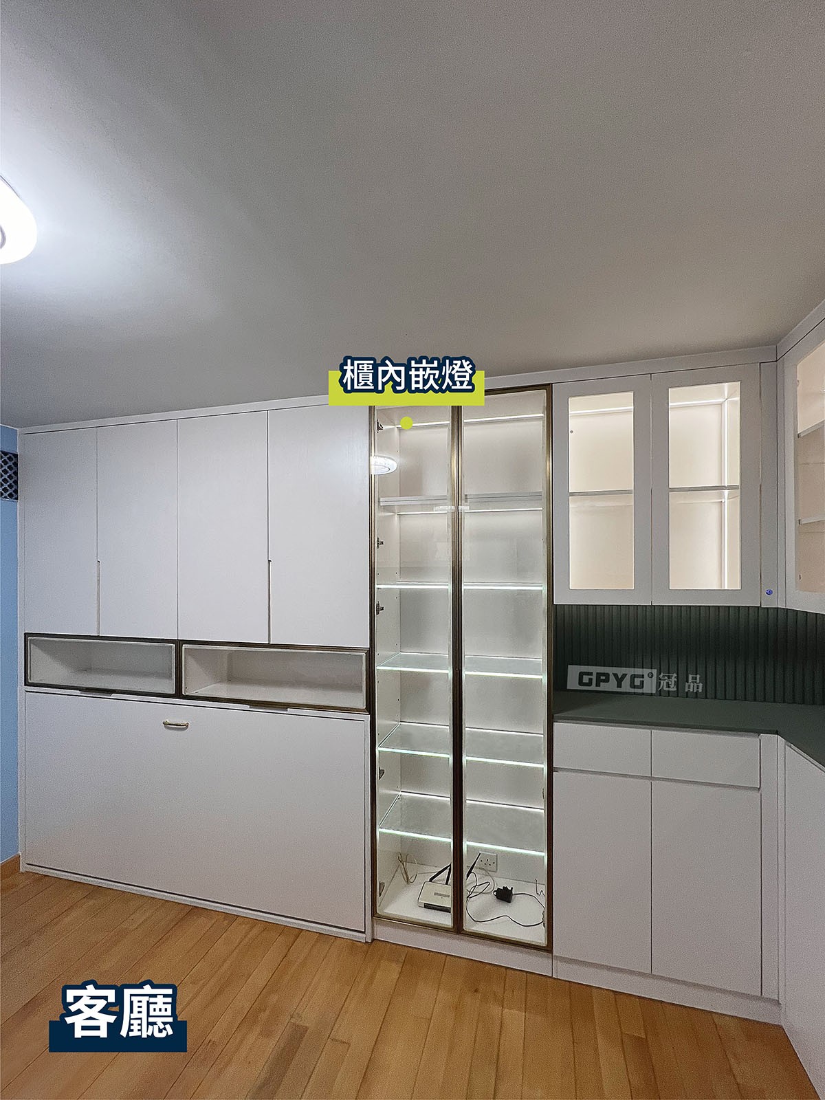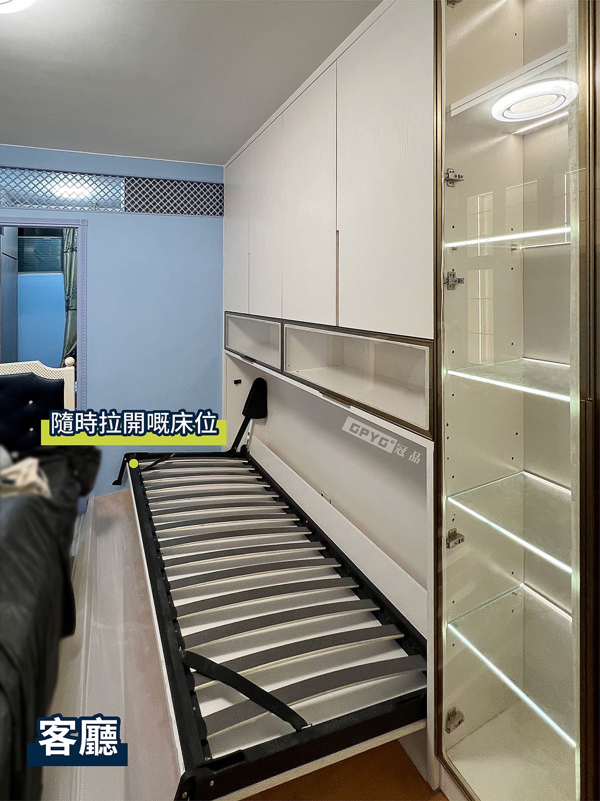 客廳儲物櫃可容納大量物品嘅同時,仲有隨時可打開嘅床,收起又唔阻地!利用大量嘅玻璃櫃門+燈帶組合,成個單位氛圍感升左唔少!