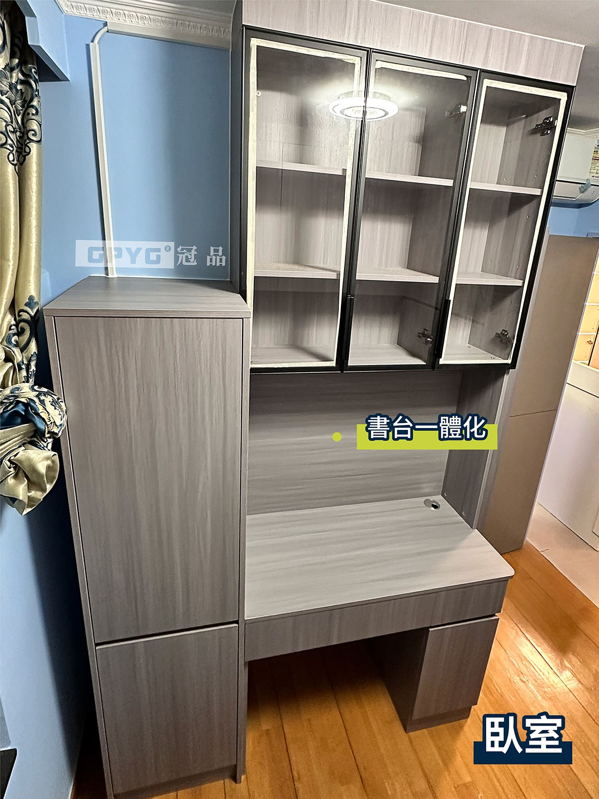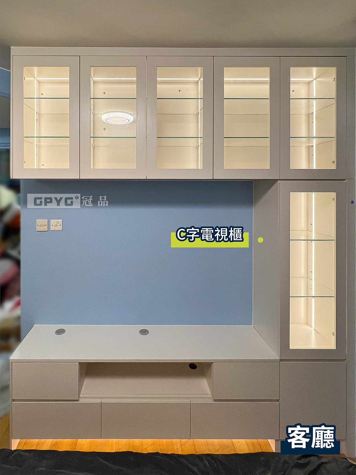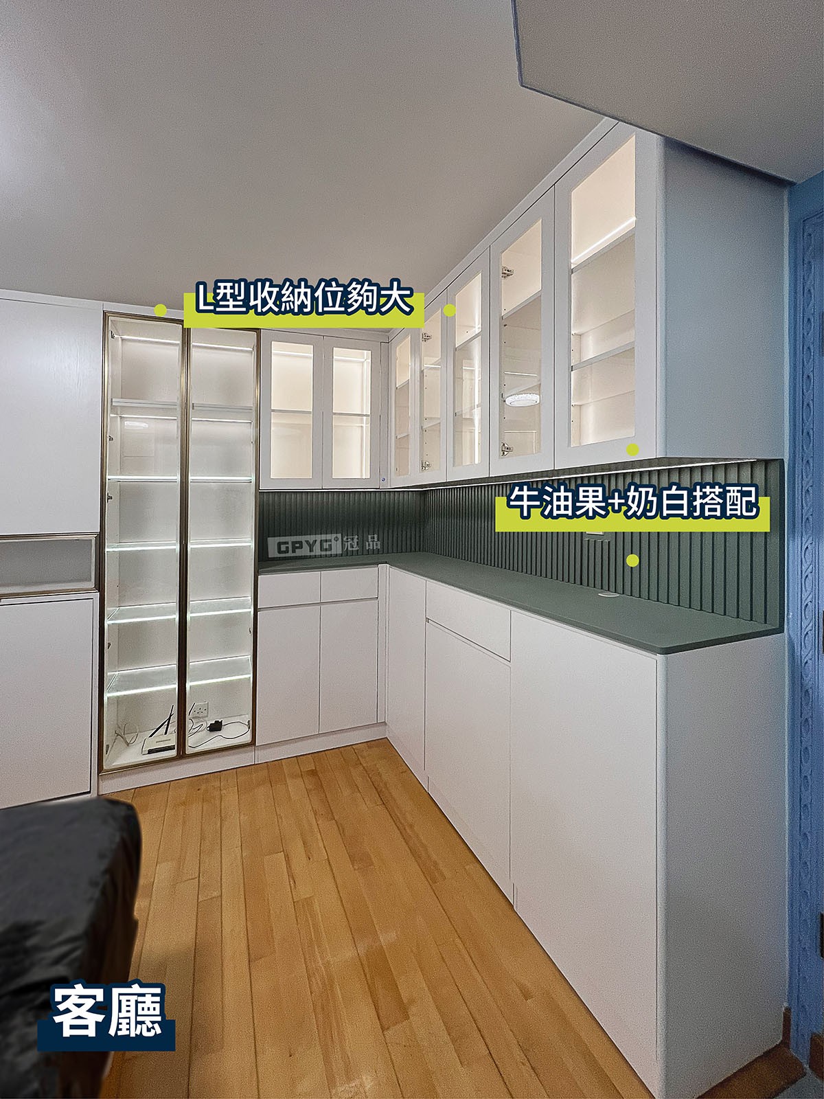 客廳儲物櫃可容納大量物品嘅同時,仲有隨時可打開嘅床,收起又唔阻地!利用大量嘅玻璃櫃門+燈帶組合,成個單位氛圍感升左唔少!