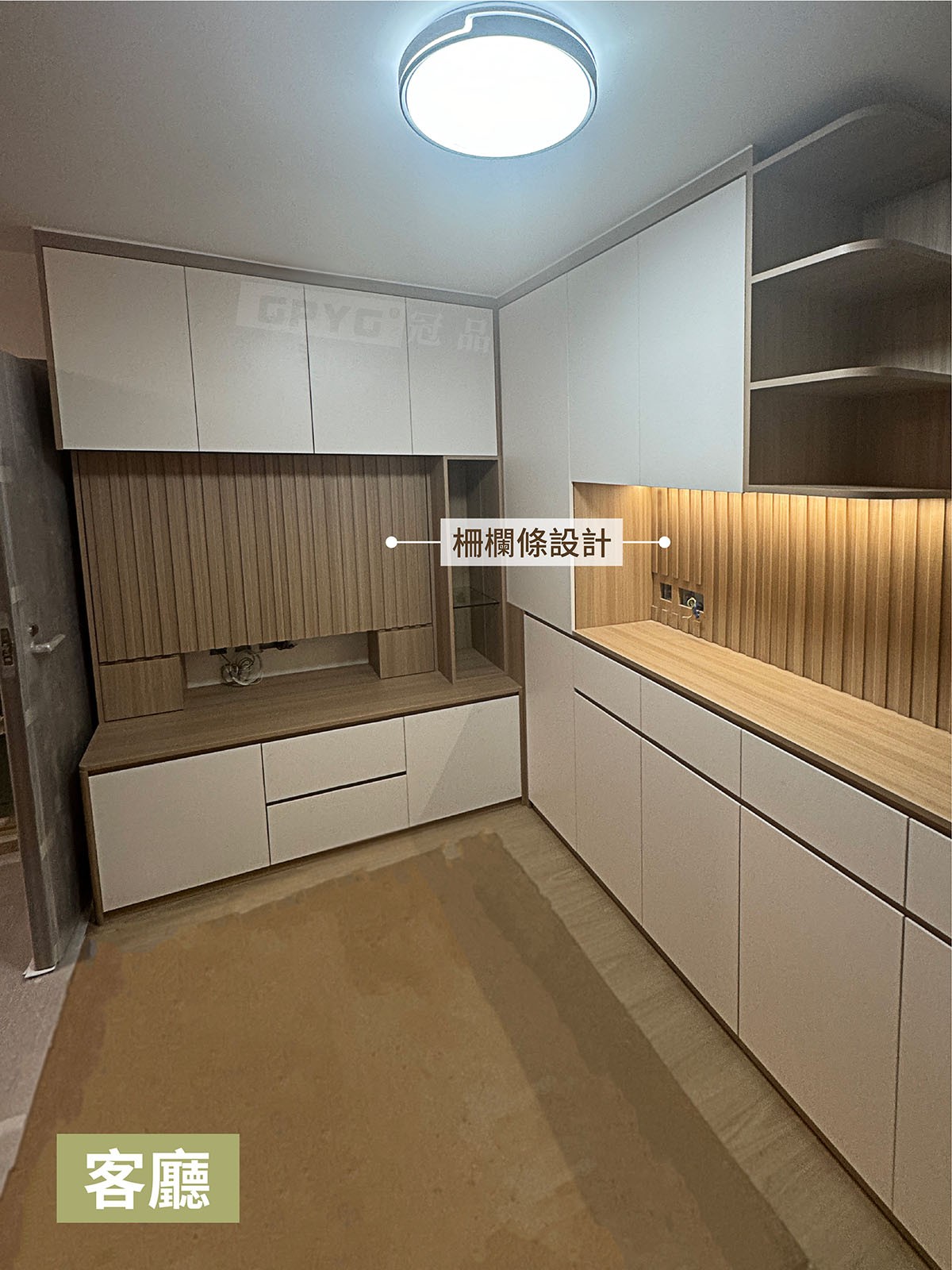 為考慮不同功能區域嘅合理分隔,打造嵌入式、轉角櫃、靠墻到頂等嘅設計🥰,避免擠逼感,又提高空間利用率👏😆。淺褐色嘅柵欄條夠曬養眼🥳✨。